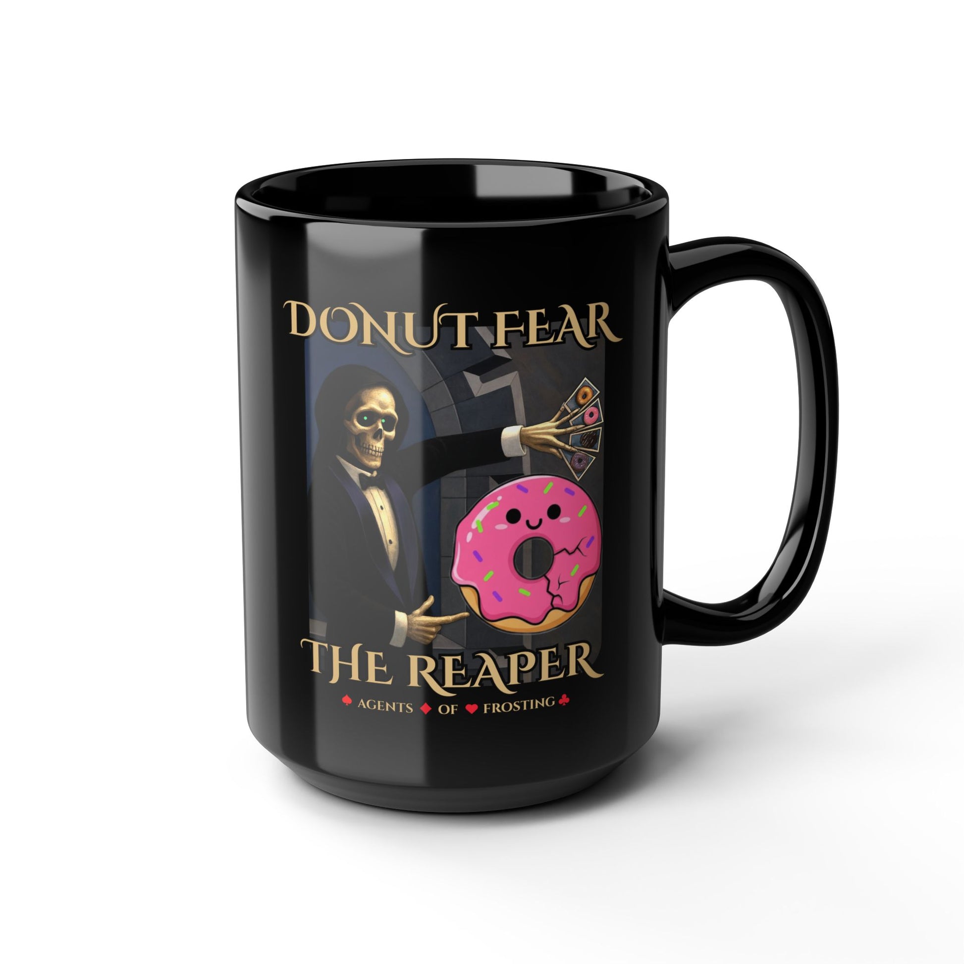 Donut Fear The Reaper Mug | Funny Grim Reaper Coffee Cup | Black Ceramic Mug for Dark Humor