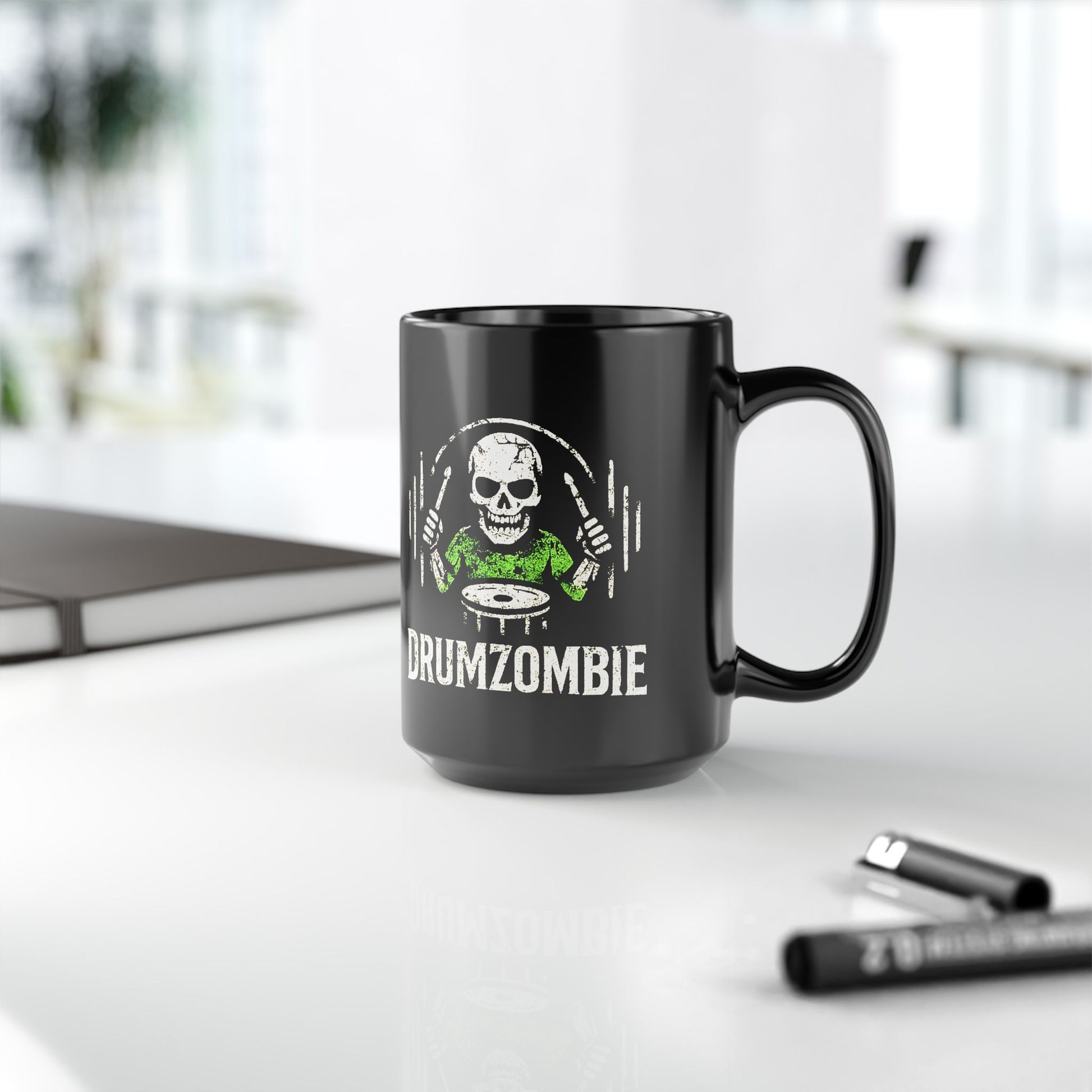 Some rhythms never die. This black ceramic mug features the iconic DrumZombie drummer - skull head, green tee, sticks in hand, locked in eternal rhythm within sonic waves. Because even death can't stop a true creator.
